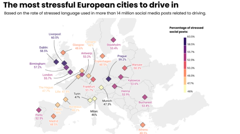 The research analysed the levels of stress-related language in over 14 million geotagged, driving-themed social media posts from 150 European cities in 2025.